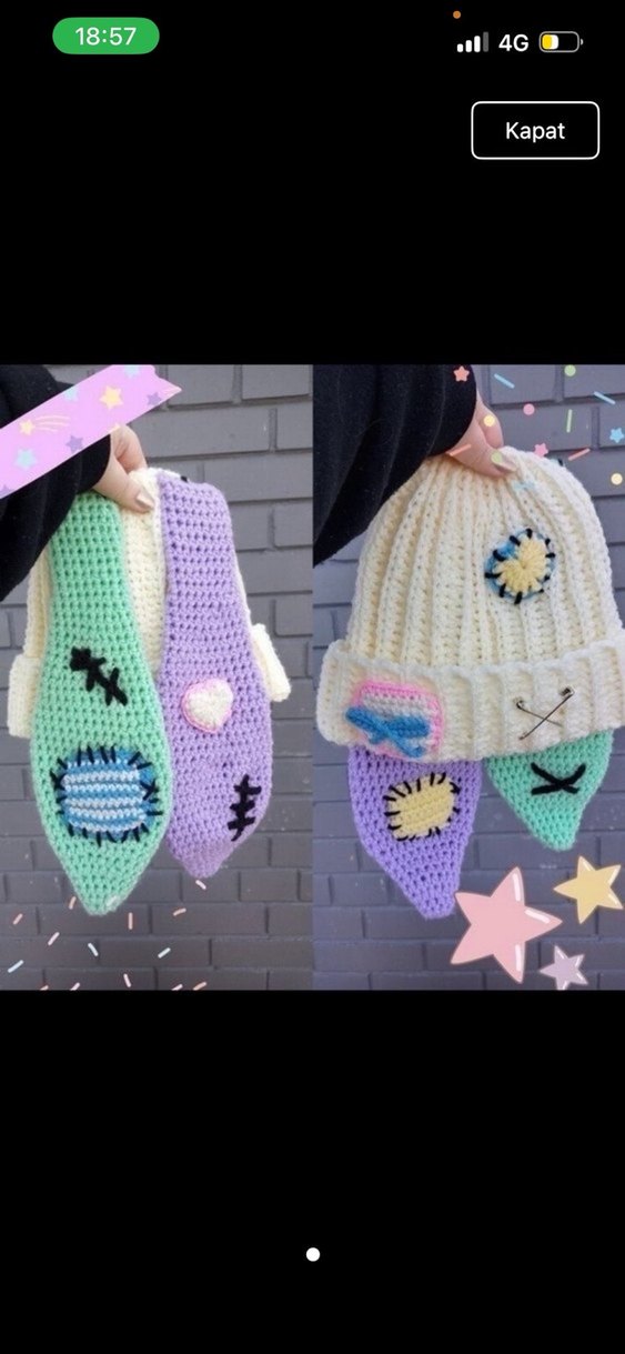 Nakışlı detaylara sahip, pastel renklerde çocuk örgü bere ve atkı seti. Bohem ve retro sokak modası tarzında.