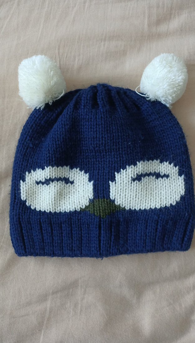 Renkli mavi örgü bere, nakışlı gözler ve iki beyaz ponponla, oyuncu ve retro bir tarz sunar.