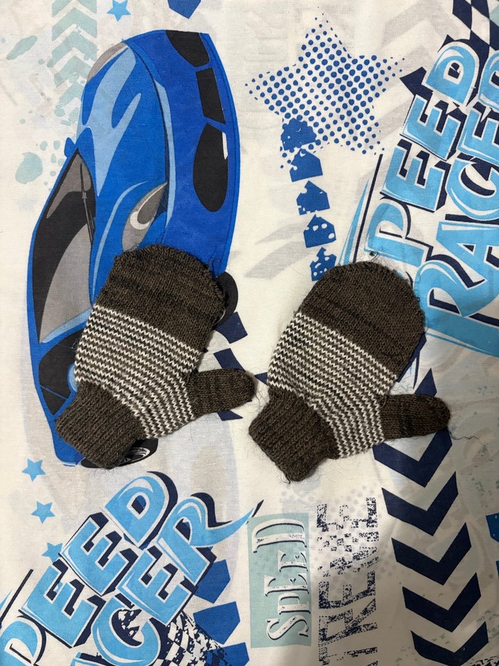 Çocuklar için kahverengi ve gri tonlarda, rahat örme tasarıma sahip sıcak tutan eldivenler.