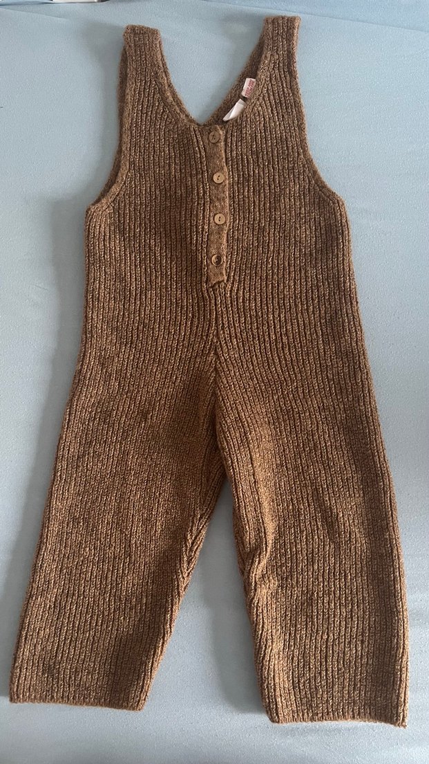 çocuk için kahverengi, örme ve fitted kesim tulum. Düğmeli ön kısmı ve kolsuz yapısıyla rahat kullanım sunar.