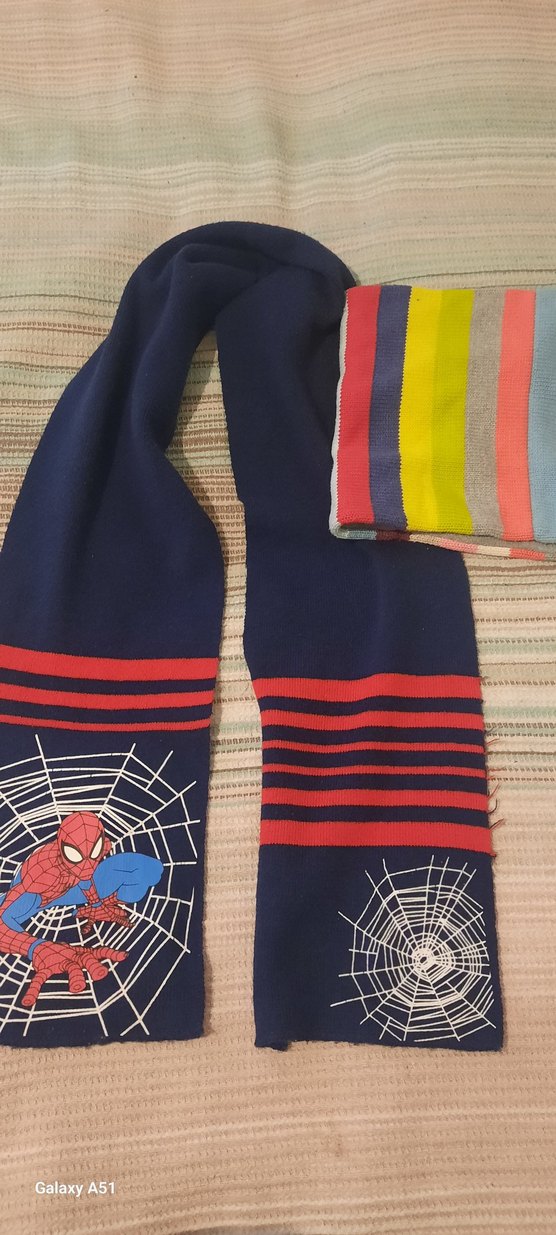 Çocuklar için örme tekstil atkı, Spiderman ve ağ baskılı, retro ve pop kültürü tarzında renkli tasarım. ️
