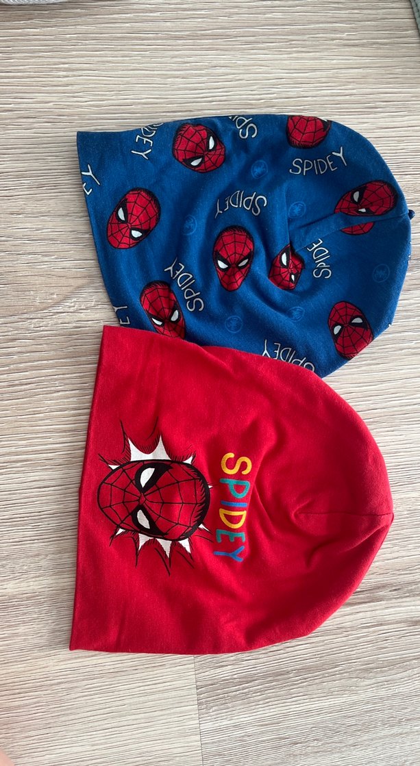 Yumuşak ve sıcak kumaştan, örme iki bere. Biri kırmızı, büyük Spidey baskılı; diğeri mavi, tekrarlayan Spiderman desenli.