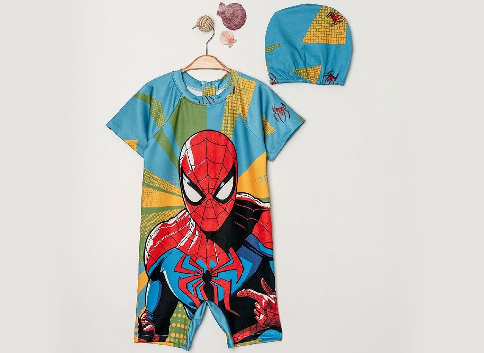 Renkli, fitted kesim çocuk mayo seti, kısa kollu ve yuvarlak yaka. Örümcek Adam baskılı ve eşleşen şapka içerir. ️3-4-5-6-7-8-9-10-11-12 yaş