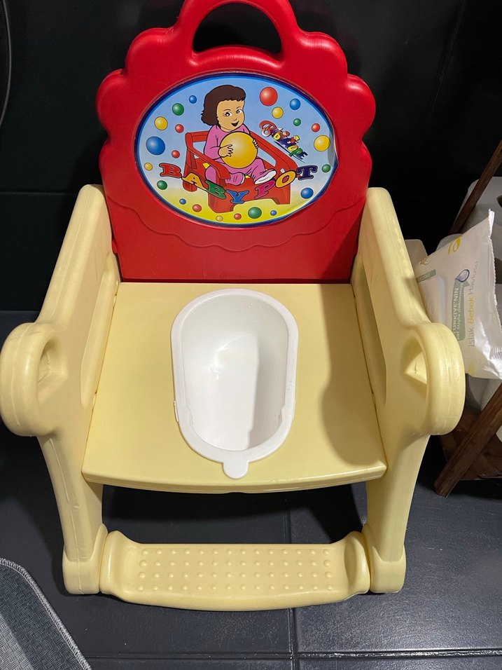 Renkli sırt dayanağı ve çıkarılabilir beyaz oturaklı çocuk tuvalet eğitimi sandalyesi. Kolçaklı ve ayak dayamalı rahat tasarım.