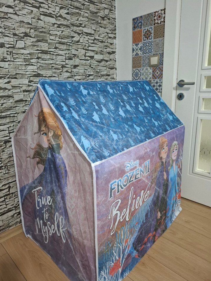 Disney Frozen II temalı, mavi renkli çocuk oyun çadıri 'Believe' ve 'Time to Myself' yazılarıyla hayal gücünü destekler. ❄️