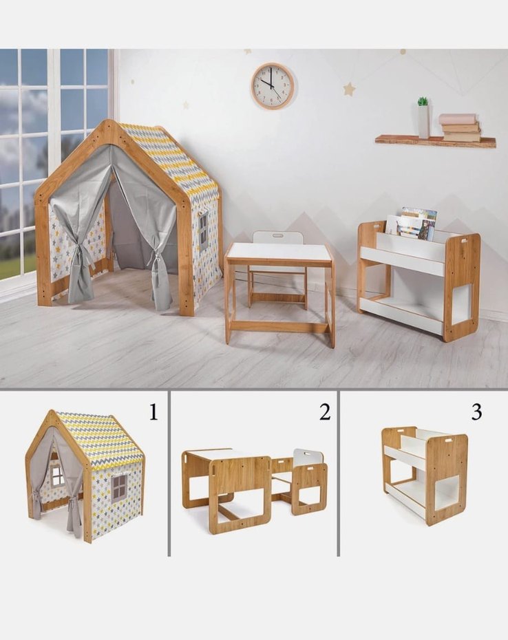 Beyaz ve açık ahşap renklerde çocuk oyun çadırı, masa-sandalye ve rafdan oluşan oyun mobilyası seti. Rahat ve düzenli oyun alanı sağlar yer İstanbul Kadıköy