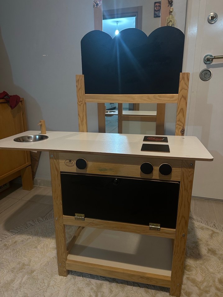 Ahşap çocuk oyun mutfağı, beyaz tezgah, yerleşik lavabo ve ocak ile birlikte yaratıcı oyun için kara tahta panel içerir.