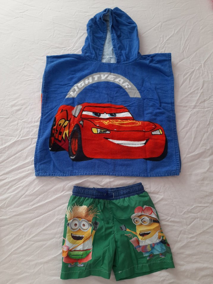 3-4 yaş deniz şortu, panço şeklinde plaj havlusu ve şişme yelek. sorunsuzdur. hepsi 3-6 yaş arası kullanılabilir.