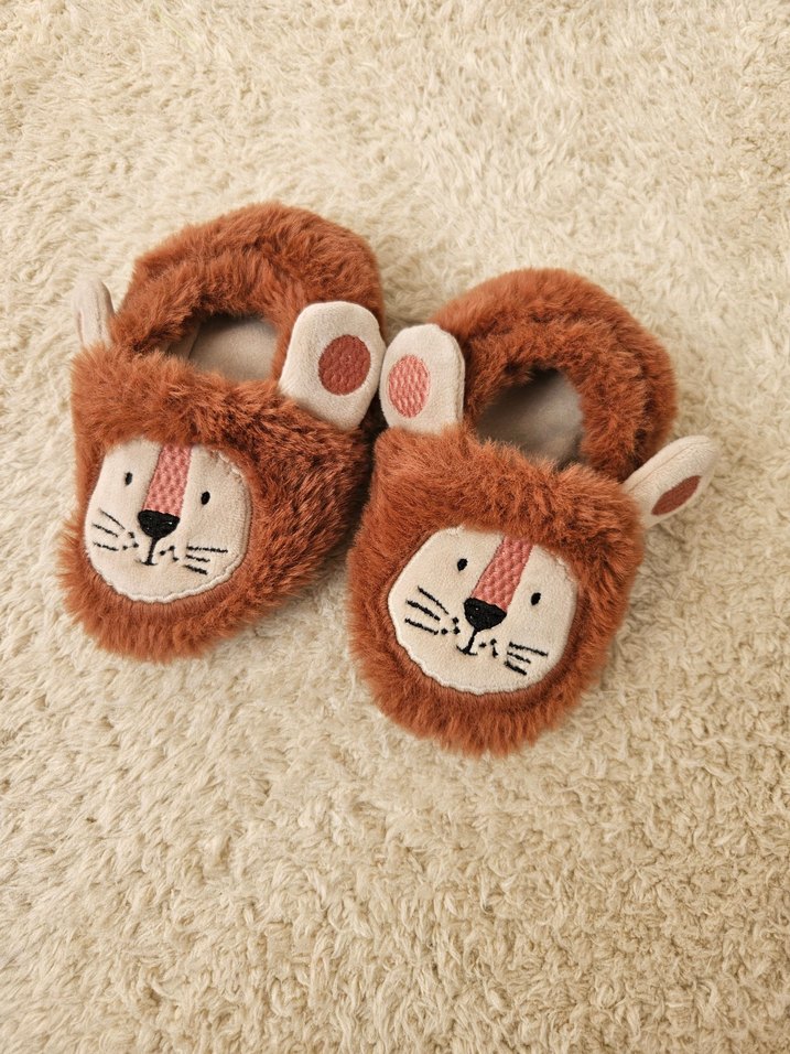 Kahverengi, yumuşak ve sıcak kumaştan yapılmış, kürk detaylı erkek çocuk terlikleri, eğlenceli hayvan yüzü tasarımıyla rahat ve konforludur