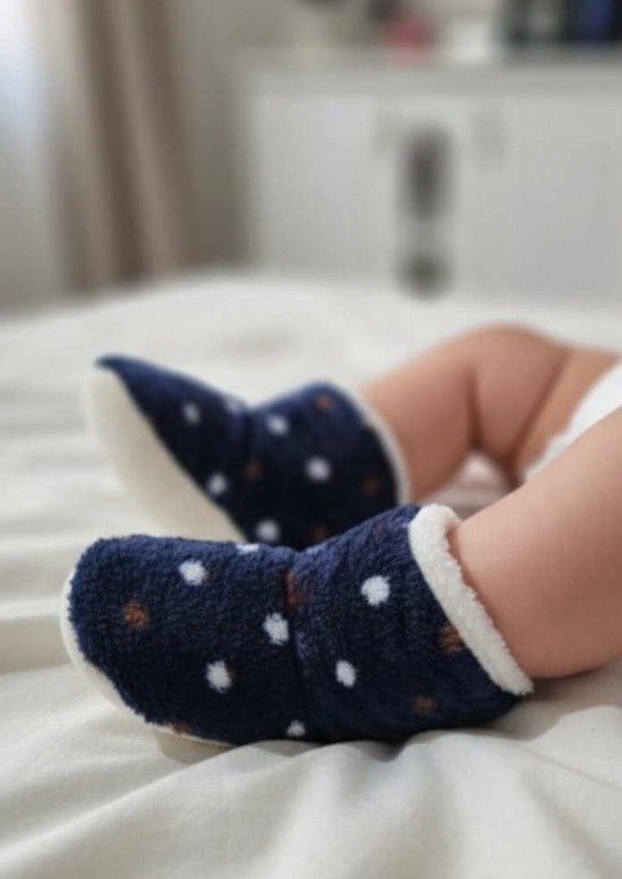 1 Çift Fiyatıdır Çocuklar için sıcak ve yumuşak kumaştan yapılmış, renkli noktalı desenli lacivert panduf. Küçük ayaklar için konfor ve sıcaklık sağlar.