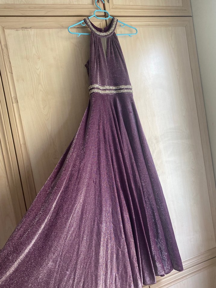 11-12-13 yaş arkası sayesinde genişleyerek denk geliyor Parlak mor renkli, uzun ve drapeli tasarıma sahip abiye elbise. Yüksek yakalı, askılı ve beli detaylı, klasik ve modern dokunuşlar içerir.