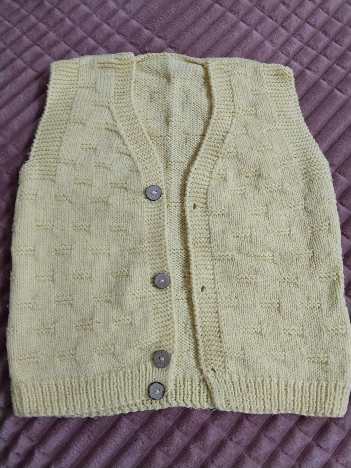 Pastel sari renkte, V yaka ve düğmeli çocuk örgü süveter. Kolsuz, regular fit ve sade klasik tarzda. kiz ya da erkek bebek yelegi 9/24 ay