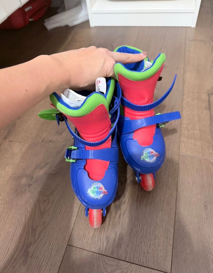 Renkli erkek kaykay patenleri, kauçuk malzeme ve pjmasks desenli, spor ve athleisure için Velcro kayışlarla sabitlenmiştir. 26-30 numara aralığında kullanılabilir