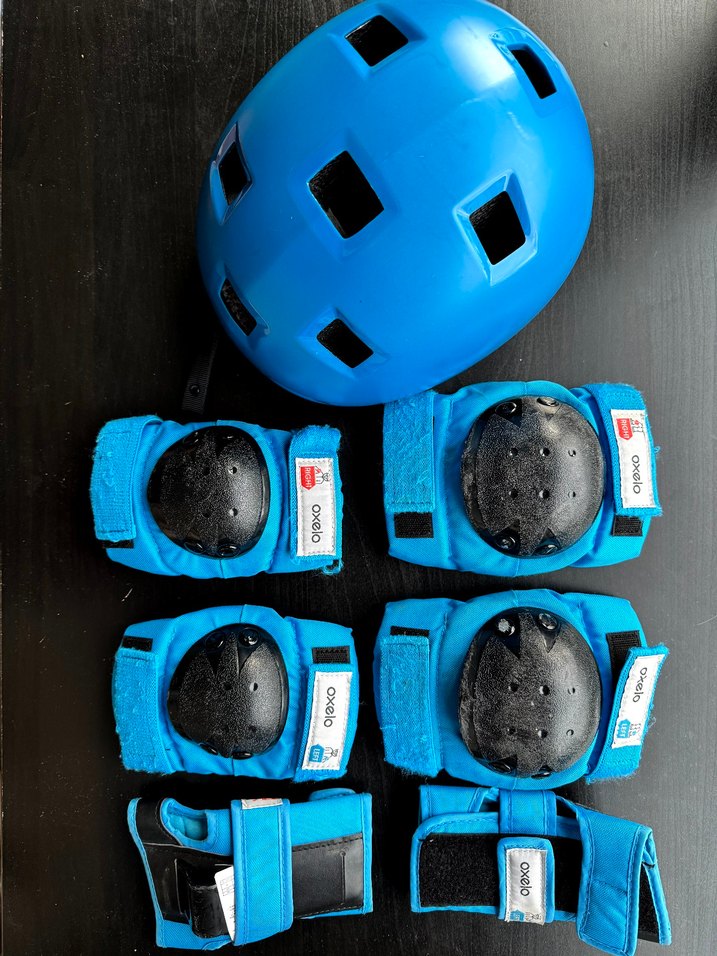 Oxelo basic koruma seti. Yeni başlayanlar güvenliği için kask, diz, dirsek ve bilek mavi korumalıkları. XS beden, 25-50 kg 6-10 yaş için uygundur.