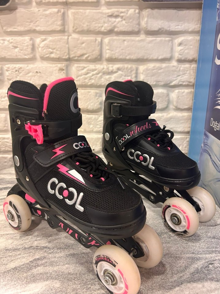 Renkli baskılı ve bağcıklı kiz pateni, kauçuk CCOL markası üzerindedir. bir kere giyildi sadece 34 ve 37 numara arasi buyuyebiliyor tekerlekleri isikli ve yer degistirilebiliyor.