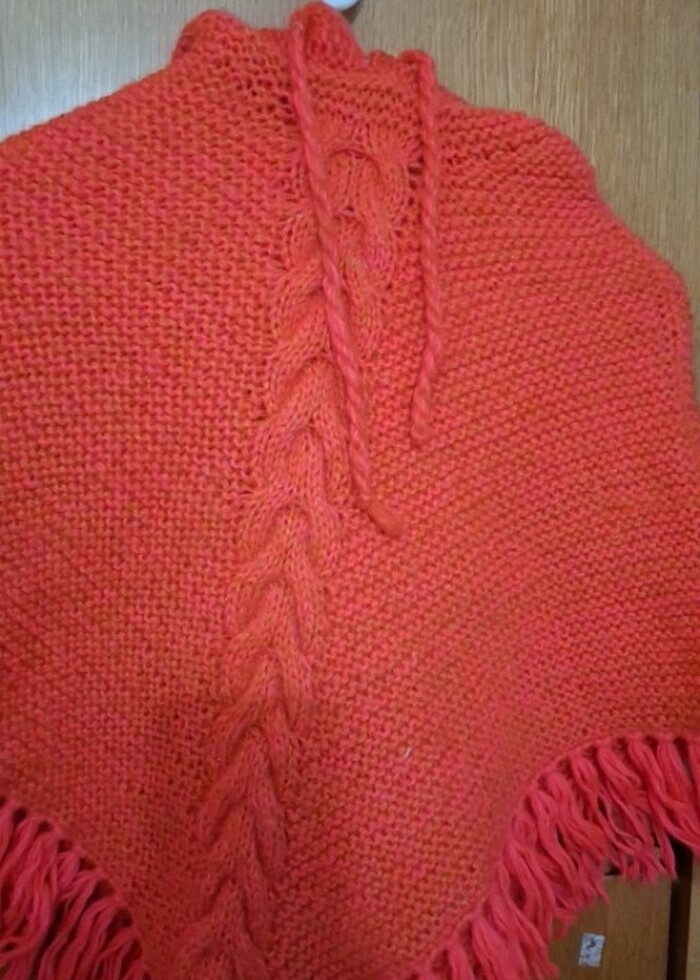 Çocuk pelerin..kapüşonlu..yakadan tek düğmeli..3 ile 5 yaş arası..koyu şeker pembesi ile turuncu ebruli karışık ip..burna örnekli..yakadan uzunluğu 50 cm..en 62 cm..