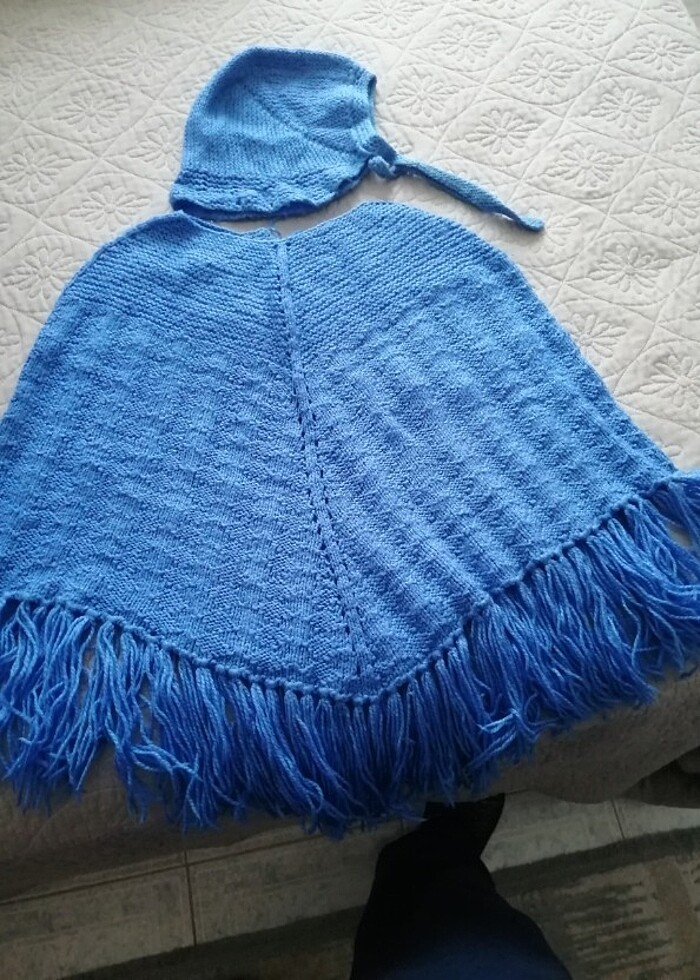 El örgüsü şapka ve pelerin. 1 & 3 yaş çocuk pelerini, ölçüleri en üst kısımdan ölçüldü 44cm boy 50cm püsküller hariç.