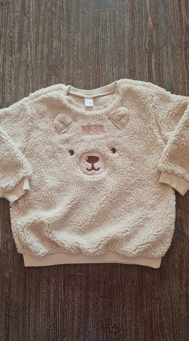 Bej renkli, uzun kollu, yuvarlak yaka çocuk sweatshirtü. Bol kesim ve yumuşak peluş ayı detayları ile rahat ve sıcak tutar.