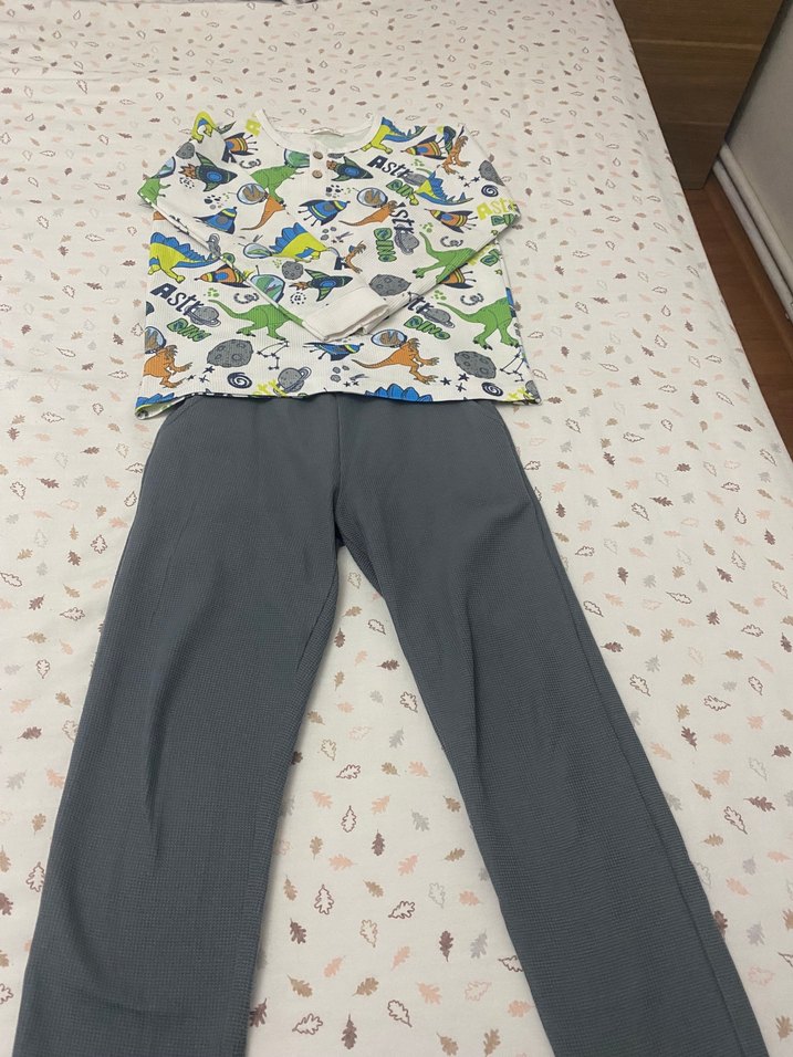 Çocuk pijama takımı önünde belli belirsiz leke bulunmaktadır