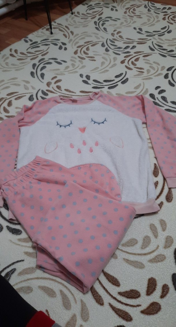 Pembe baskılı, uzun kollu, bol kesim pijama takımı.Polardır.