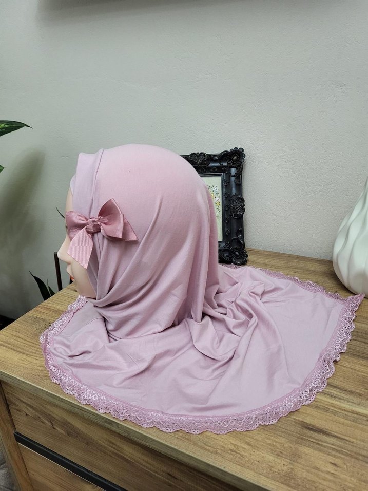 Pudra pembesi dantel kenarları ve fiyonk detaylı çocuk şalı, yumuşak sentetik kumaştan üretilmiş, sade ve rahat bir tarza sahiptir.