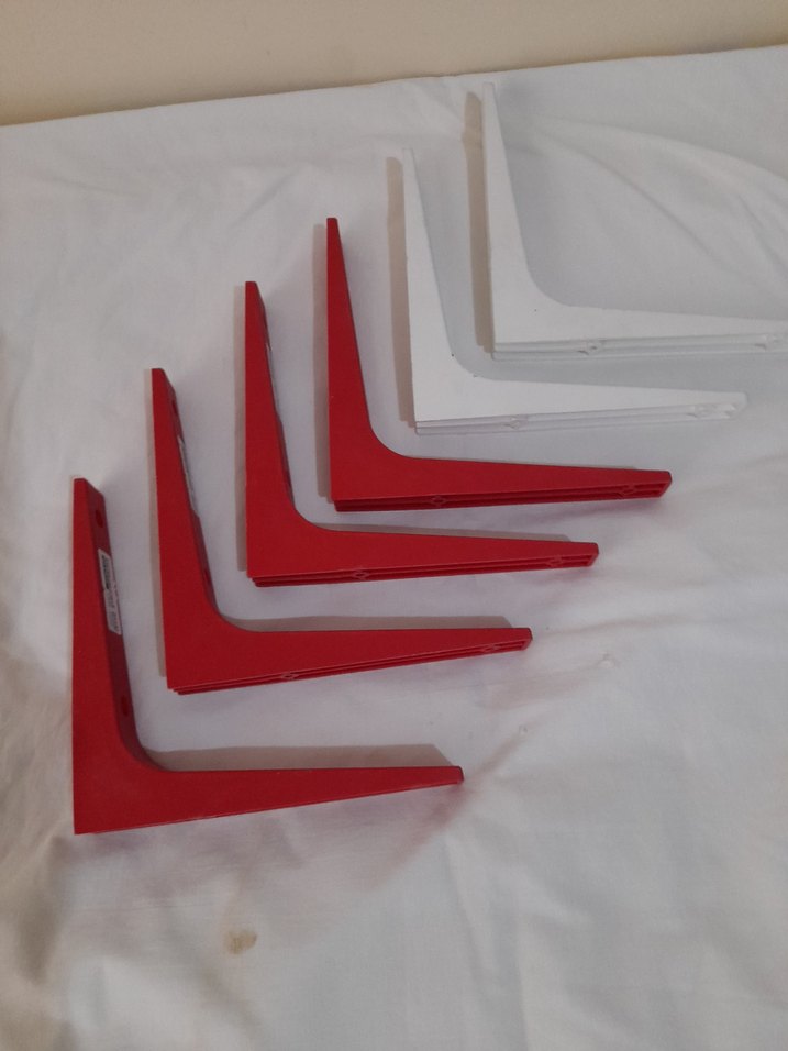 Çocuk rafları için kırmızı ve beyaz renkte, renkli ve sağlam raf askıları.