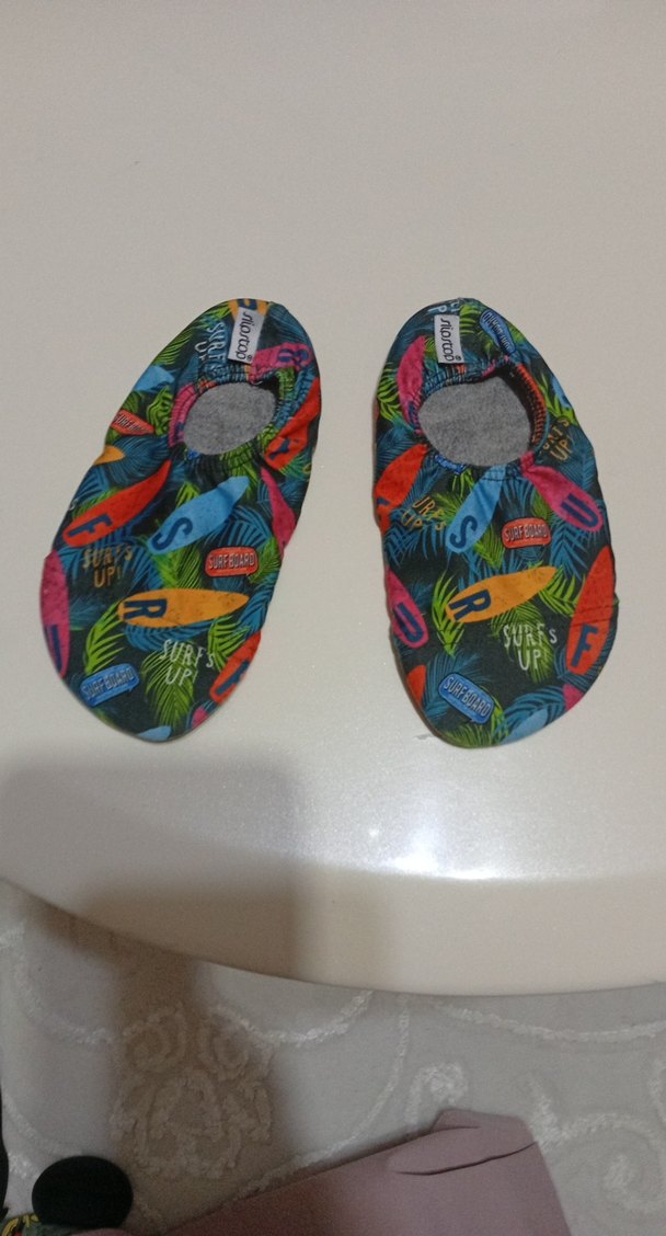 Renkli bağlamalı desenli çocuk terlikleri, kauçuk malzemeden yapılmıştır ve kolay kullanım için cırt cırtlıdır. Bohem ve retro pop kültür tarzında.