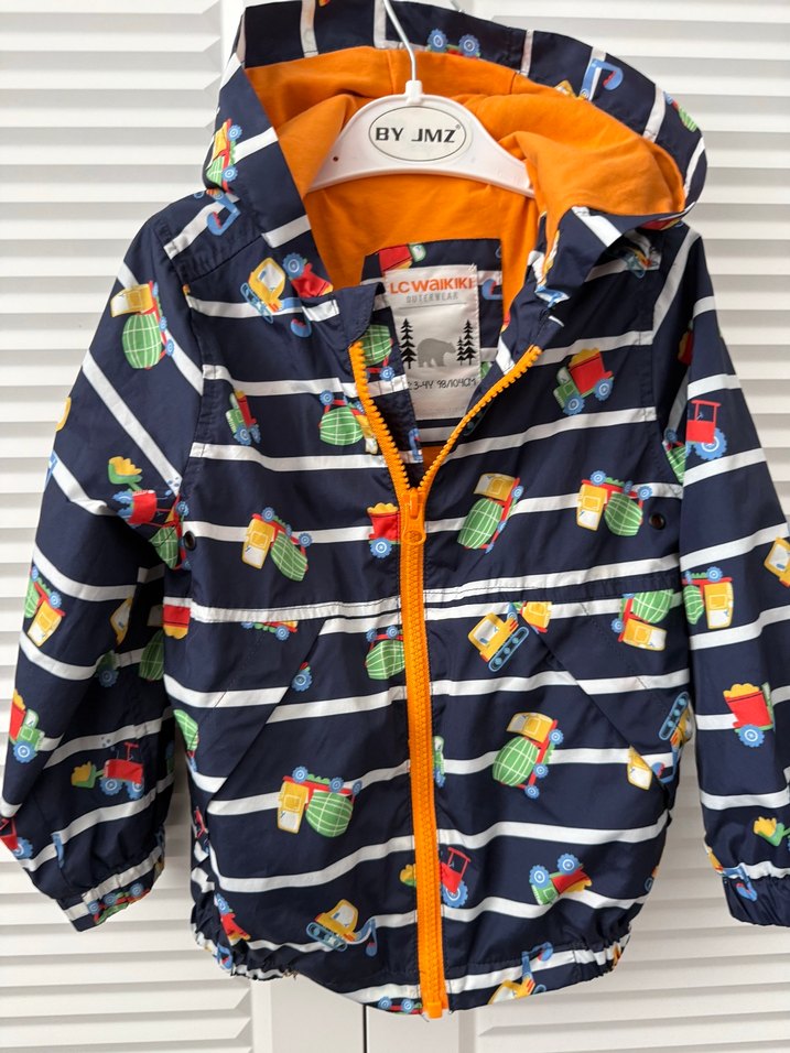 Çocuklar için kapüşonlu, fermuarlı, renkli baskılı yağmurluk. Sentetik kumaştan, bol kesim ve sokak tarzına uygun.