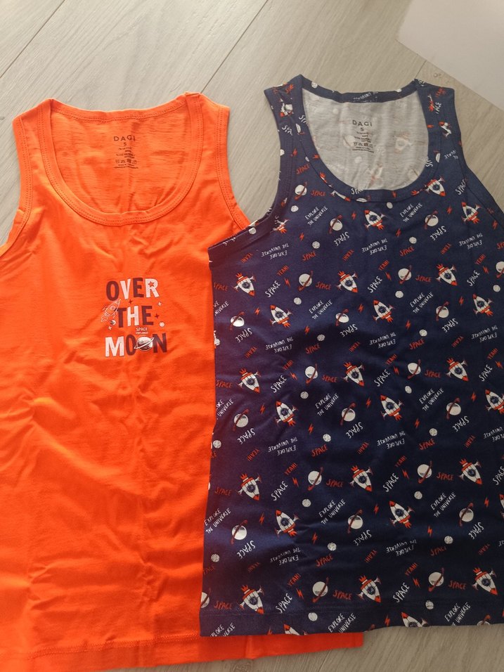 Pamuk kumaştan, kolsuz ve dar kesim iki çocuk atleti. Biri turuncu ve "OVER THE MOON" baskılı, diğeri lacivert ve renkli desenli. Rahat ve şık sokak stili .