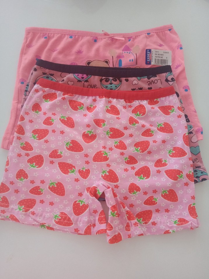 Çilek ve çizgi karakter desenli, renkli çocuk külot seti. Günlük kullanım için yumuşak ve rahat kumaş.