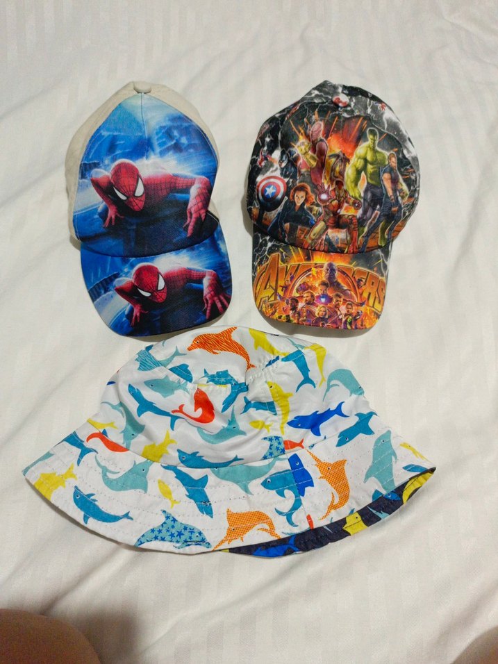 Popüler süper kahraman baskılı renkli şapkalar ve çok renkli balık desenli kova şapka seti. Ayarlanabilir cırt cırtlı sentetik kumaştan yapılmıştır.