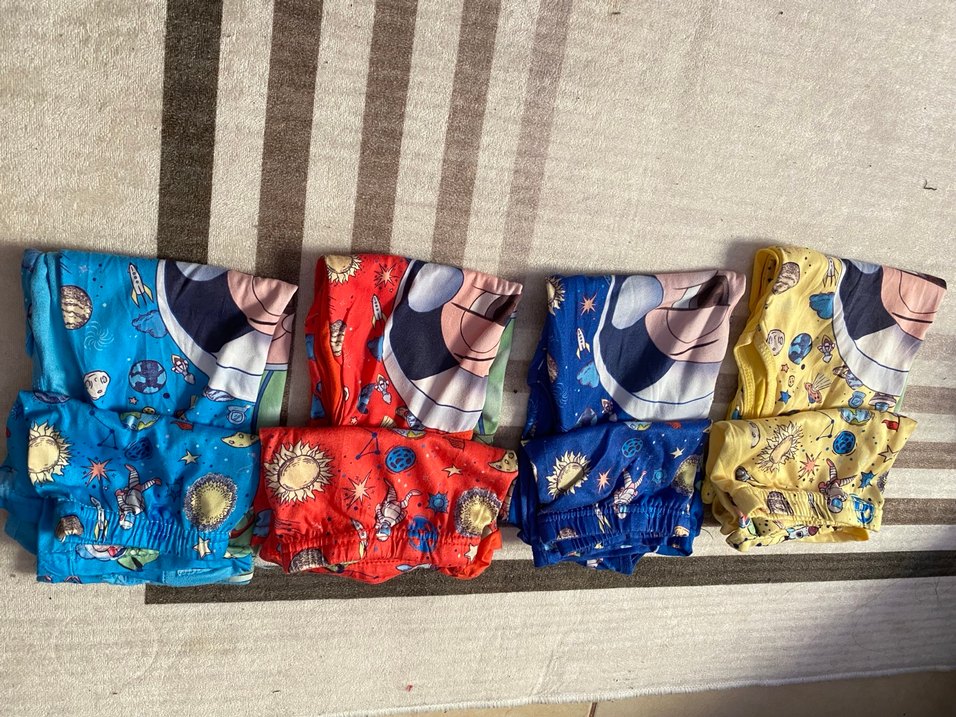 4 adet takım Çocuklar için elastik bel bantlı, renkli tie-dye desenli, uzay temalı baskılı boxerlar. Rahat ve canlı iç çamaşırı.