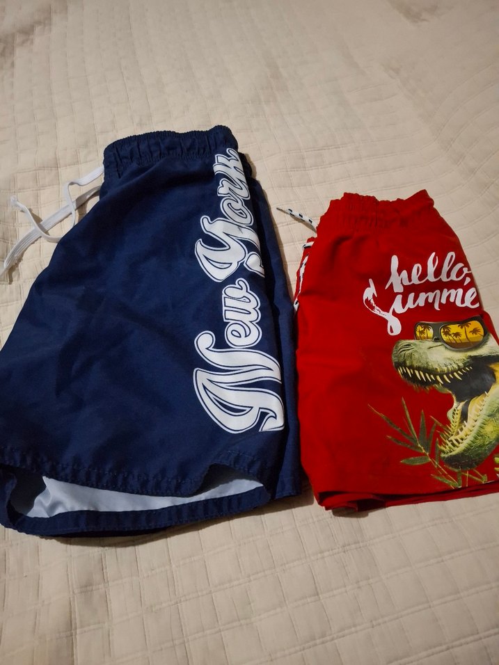 Renkli desenli çocuk şortları, elastik bel ve kısa kollu üst ile. Kırmızıda timsah baskısı ve 'hello, summer' yazısı, mavi şortta "New York" yazısı var.