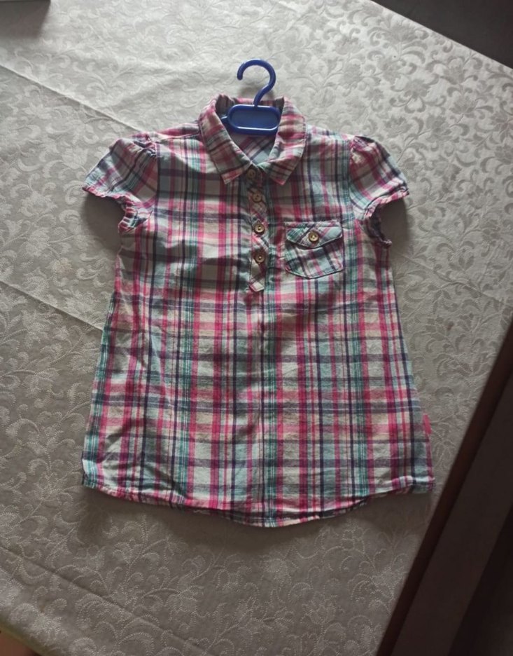 Çocuklar için renkli ekose desenli, kısa kollu, düğmeli ve küçük cepli pamuklu gömlek. Rahat bol kesim sunar.