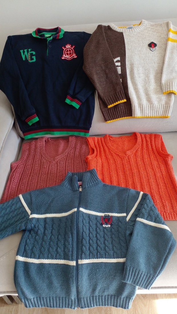 Renkli, uzun kollu, fit kesim çocuk triko kazaklar ve hırkalar. WG logosu bulunan fermuarlı ve V yakalı modeller içerir.