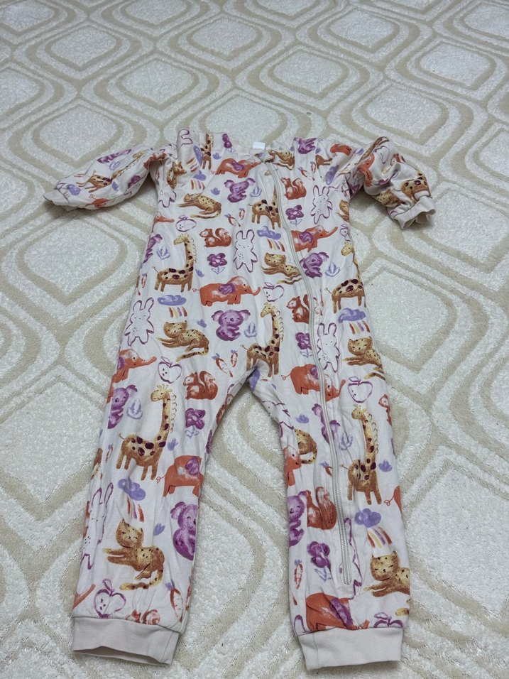 Yumuşak ve sıcak, renkli hayvan desenli çocuk uyku tulumu. Önünde kolay giyilip çıkarılabilen fermuar bulunur. 1 togg deformesi yoktur