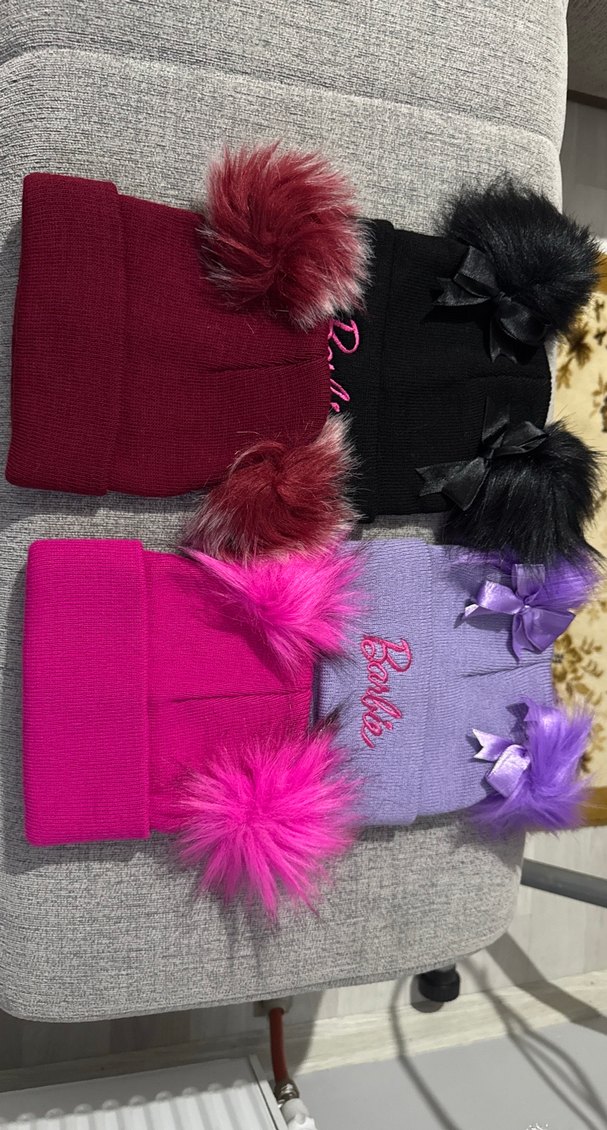 Nakışlı detaylara ve kürklü ponponlara sahip renkli çocuk bereleri. 'Barbo' yazılı, yumuşak ve sıcak kumaş, cesur goth tarzı. (Görseldeki 4 lü 200₺)