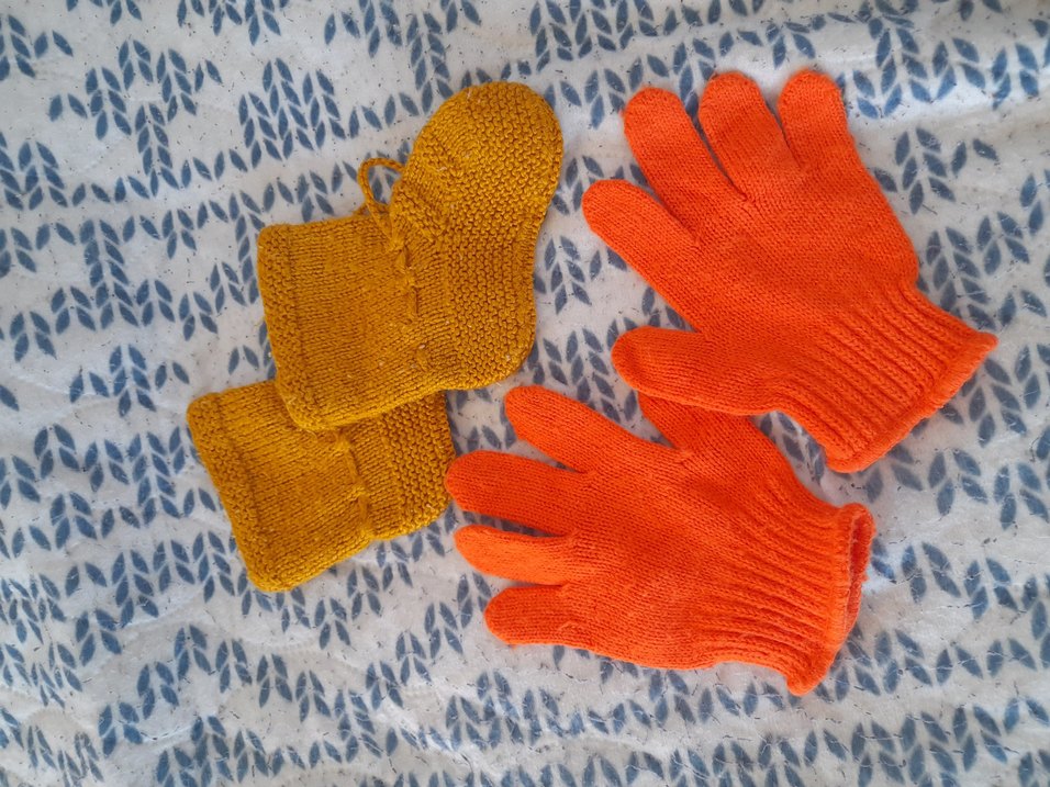 Sarı ve turuncu renklerde, sade bohem tarzda, yumuşak örgü kumaştan yapılmış renkli eldivenleri. 2-3 yaş