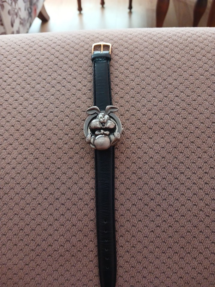 Siyah kayışlı, tokalı ve gri tavşan figürlü vintage goth çocuk saati yeni hiç takılmadı