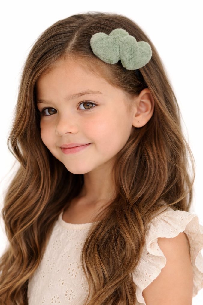 Pastel bej renkte, peluş kalp çocuk saç tokası. Sade, günlük kullanıma uygun.