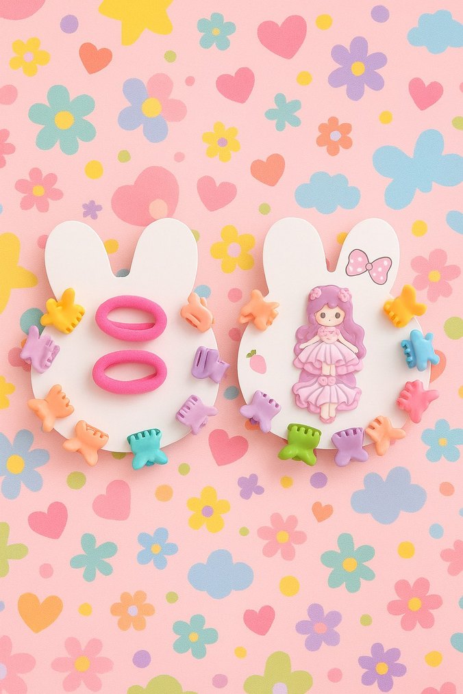 Pembe pastel renklerde çocuk saç tokaları ve lastiklerinden oluşan set, bohem ve retro tarzına uygun.