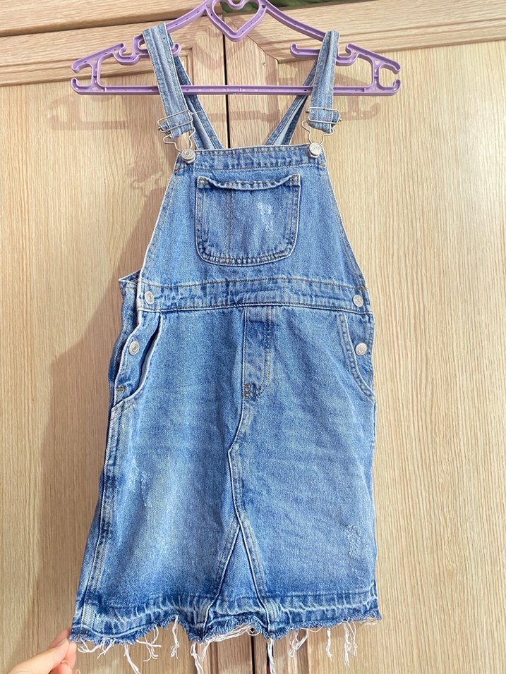 tokalı askılara ve ön cep detayına sahip, rahat kesim mavi denim midi salopet. Günlük kullanım için uygun, trend sokak stili. 9/10 yaş