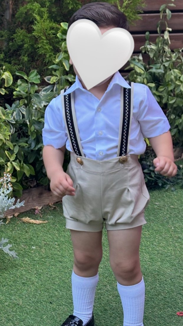 Açık bej haki arası pamuklu çocuk pantolon askılı şık salopet papyon ve gömlek 3 lü takım 1 kere giyildi