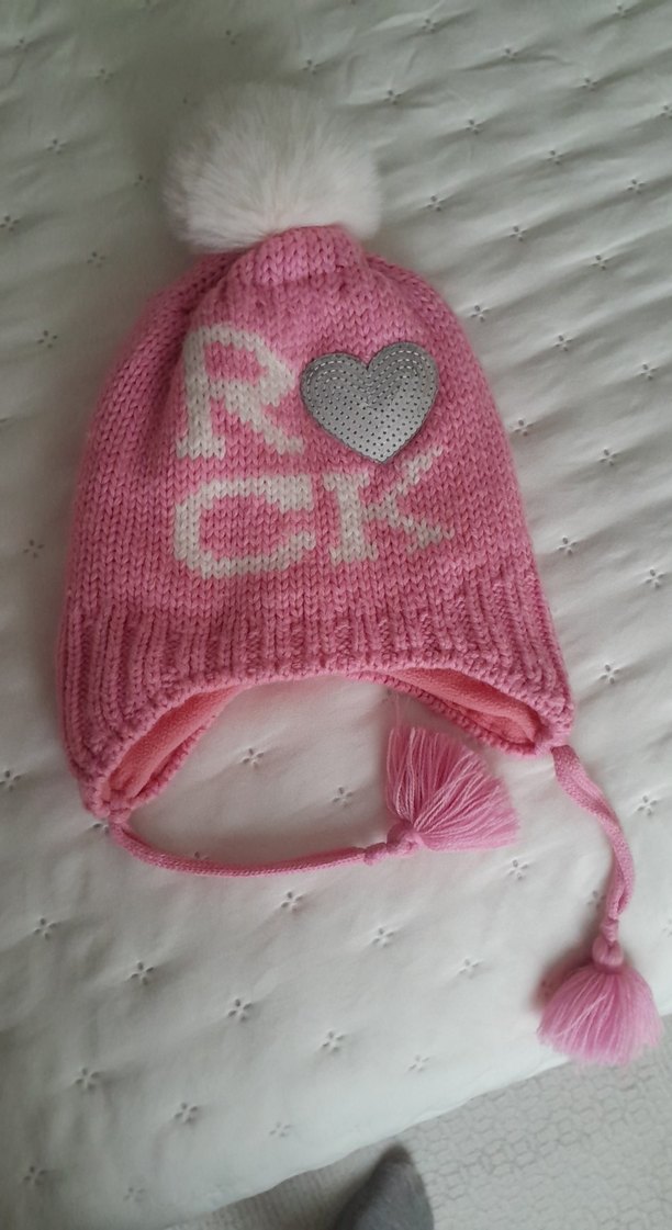 Nakışlı renkli rock punk desenli, kulaklıklı pembe çocuk triko bere, üzerinde beyaz ponpon bulunur.