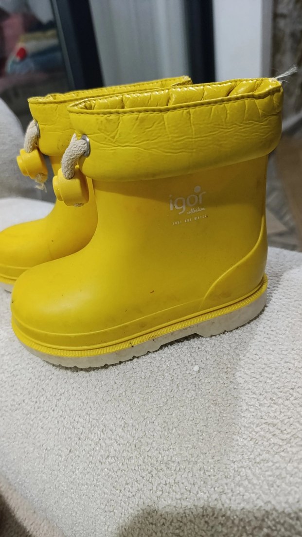çocuk için sarı ıgor botlar, sade ve kolay tasarıma sahip. Canlı renkli, normcore stilde.