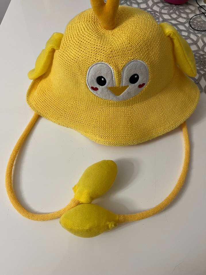 Renkli sarı örgü çocuk şapkası, nakışlı sevimli yüz ve kulak detaylarıyla, ipleri bağlanabilir şekilde tasarlanmıştır.