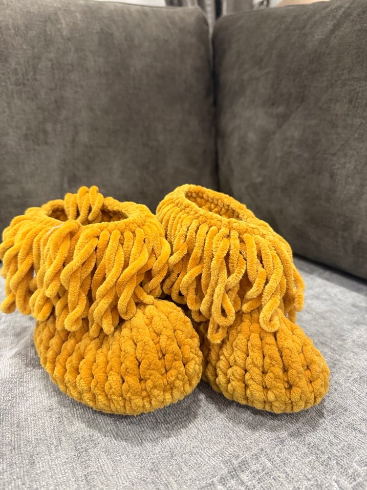 Sarı renkli örgü yünden yapılmış çocuk ev botu ,22-26 numaraya kadar uyumludur nakış detaylı ve bohem tarzıyla sıcak tutar ve renkli retro bir görünüm sunar.