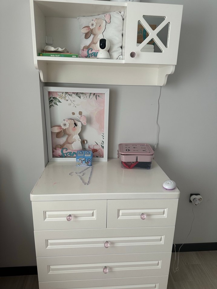 Beyaz renkte, renkli kulplara sahip çocuk şifonyeri. Çoklu çekmeceleriyle düzenli depolama sağlar, çocuk odaları için uygundur. Bebek takımının üst kısmı alt değiştirme alanı olarak kullanabilen 3+2 çekmeceli üstü raf ve dolaptan oluşmaktadır alt açma matı yanında gönderilecektir isteyen dolabından takım olarak oda takımını satın alabilir sadece üstünde ufak çizikler dışında hiç bir defosu yoktur