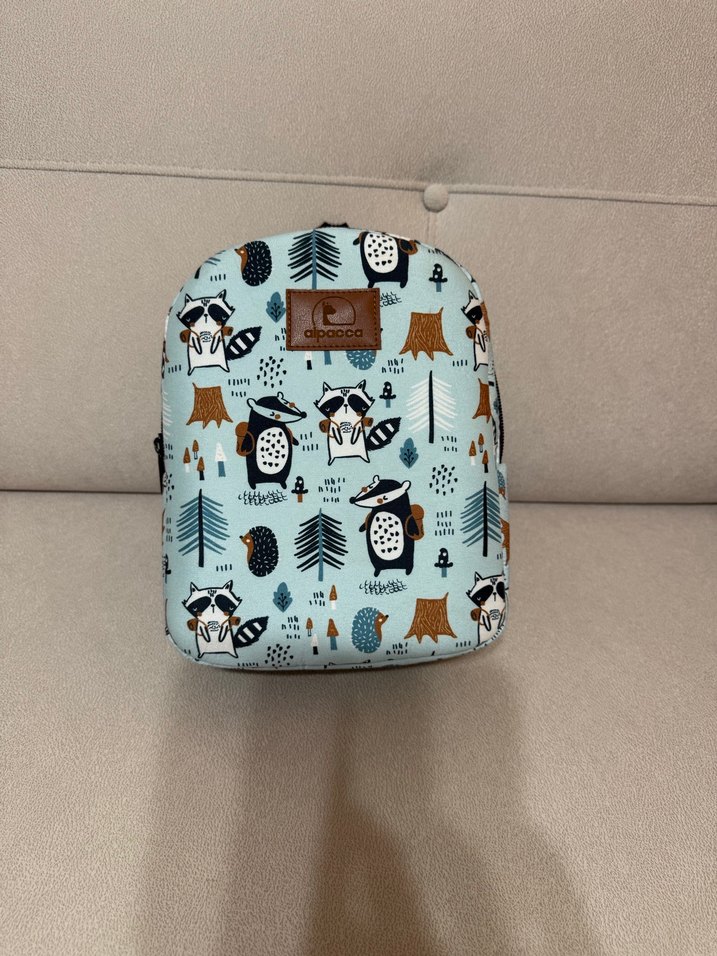 Gri zemin üzerinde kahverengi ve siyah rakun ile ağaç desenleri bulunan çocuk sırt çantası, önünde deri detaylı bir patch içerir.