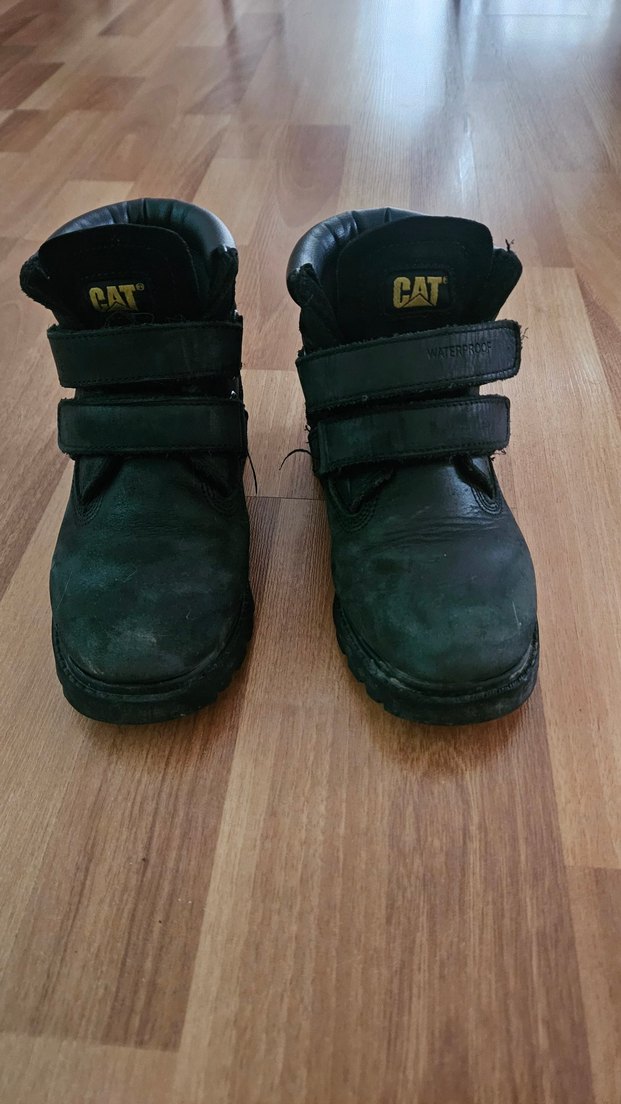 Siyah kauçuk erkek çocuk botları, bantlı tokalı, sokak stili ve rock punk havasında. CAT logosu bulunur.